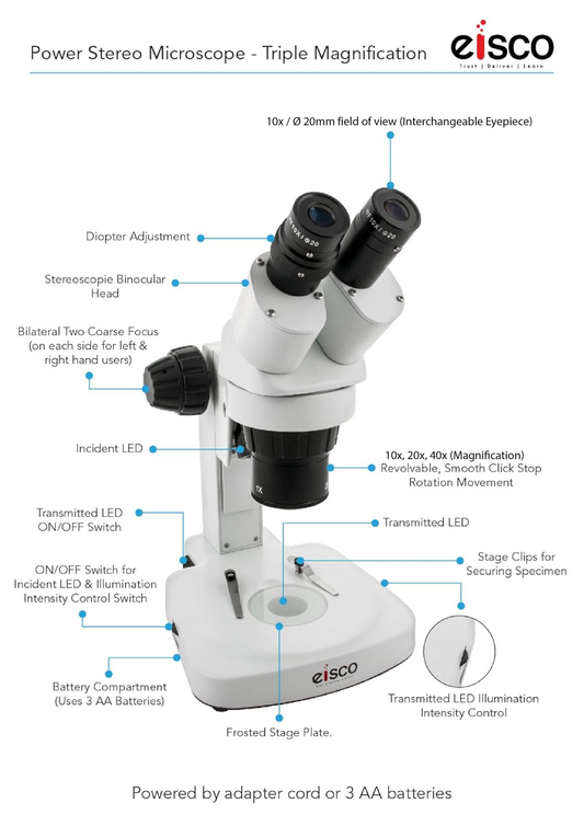 Premium Power Stereo Binocular Microscope, Triple Magnification, Wide Field 10X Eyepieces, Incident and Transmitted LED with Illumination Control