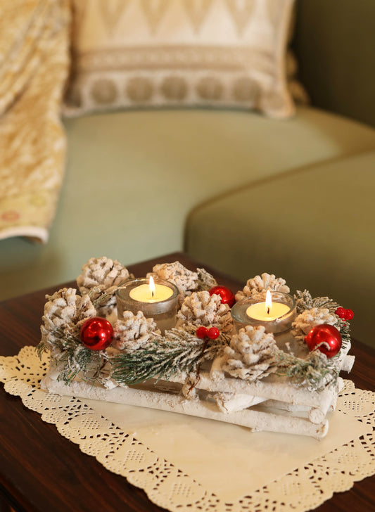 LABZIO Candle Holder Christmas Centerpiece - Snow Frosted Pinecones with Red Baubles & Berries - Wooden Base Table Decor for Christmas Tree Display, Tea Lights, or Votive Candles