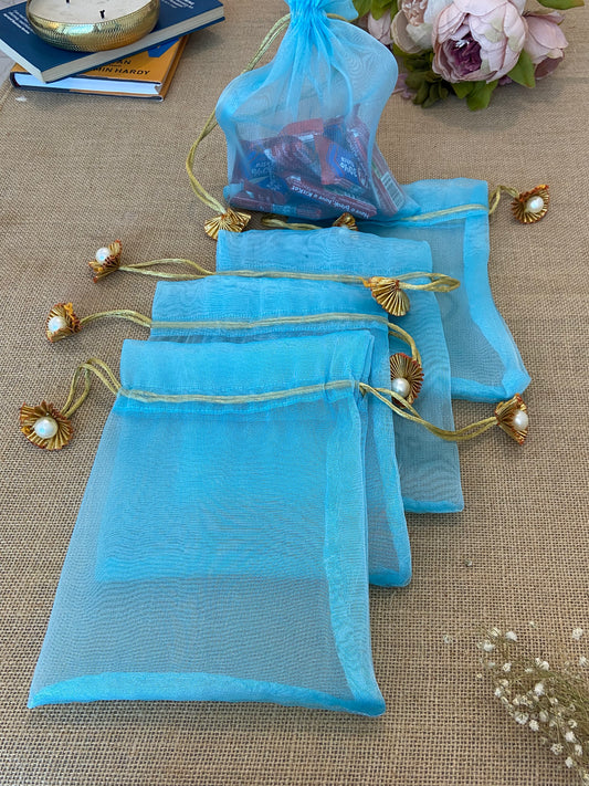 LABZIO Silk Organza Potli Bags for Return Gifts – 9x7 Inch Silk Gift Pouches with Drawstring & Flower Design, Wedding, Mehendi, Party Favor Bags, Jewelry Pouch - (Pack of 5)