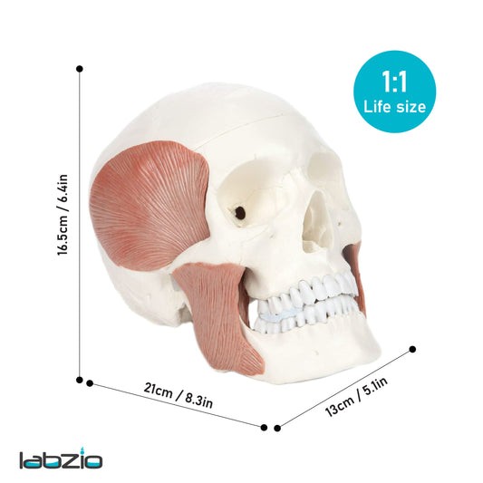 LABZIO - Premium 3-Part Human Skull Model with Masticatory Muscles, Life Size Anatomical Skull Cast from Real Human Bones Shows Range of Motion of Jaw