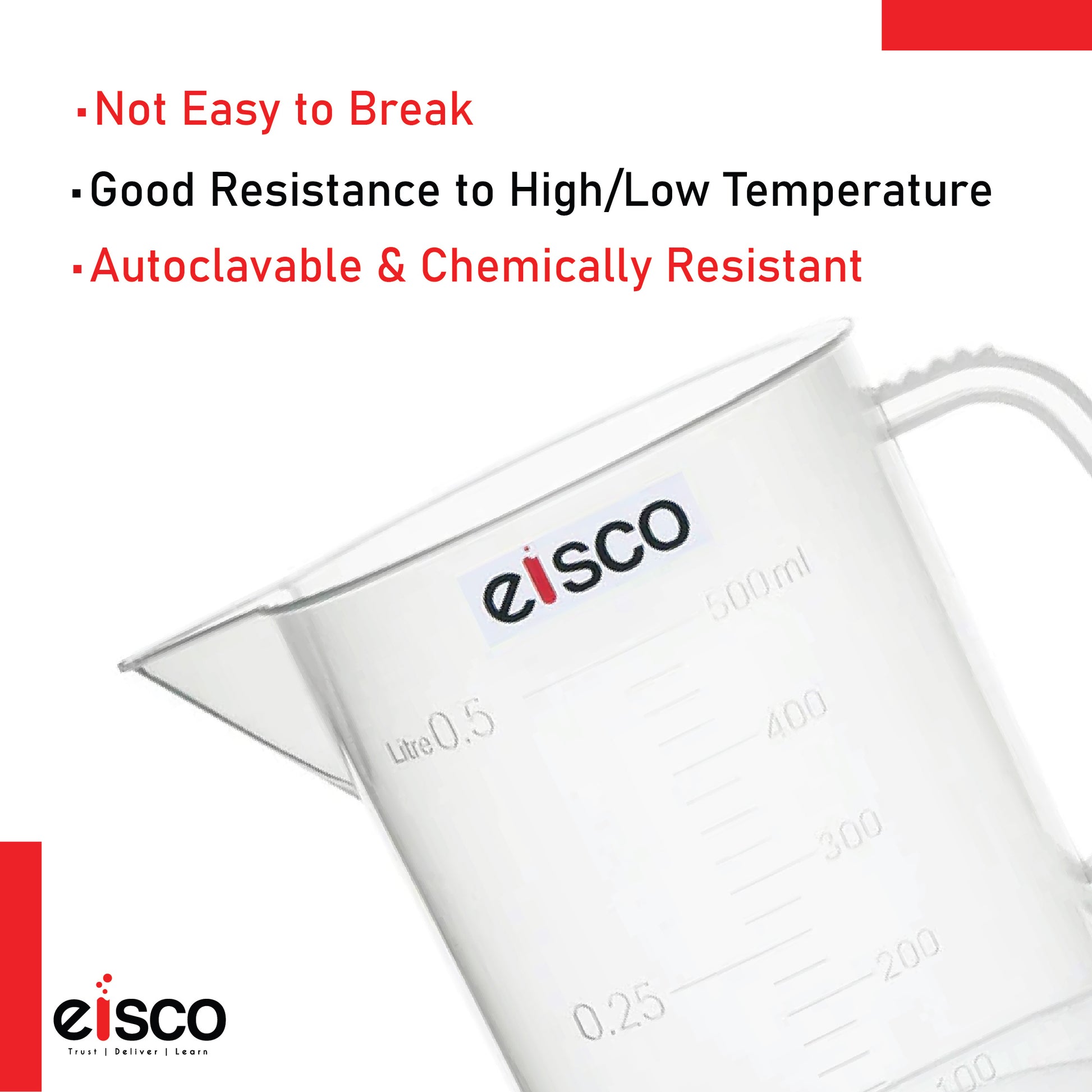 Beaker with Handle and Spout (Measuring Jug), 500 ml, Short Form, Made of Polypropylene, Graduated, Autoclavable, Good Chemical Resistance