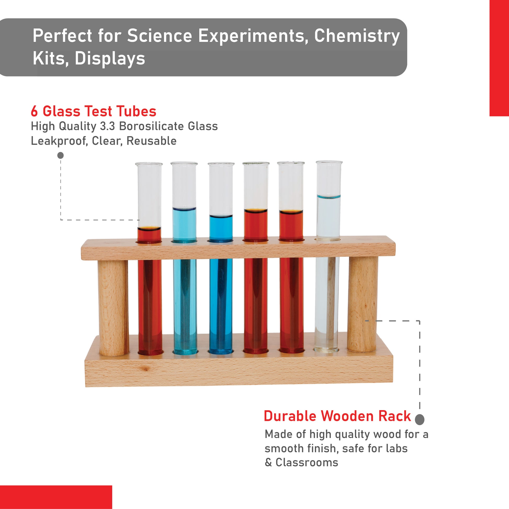- 6 Test tubes of length 150 mm, dia. 18 mm made of borosilicate glass 3.3, Rimmed, Hand Made, Blown, Accurate Size and Consistent Wall Thickness, are included