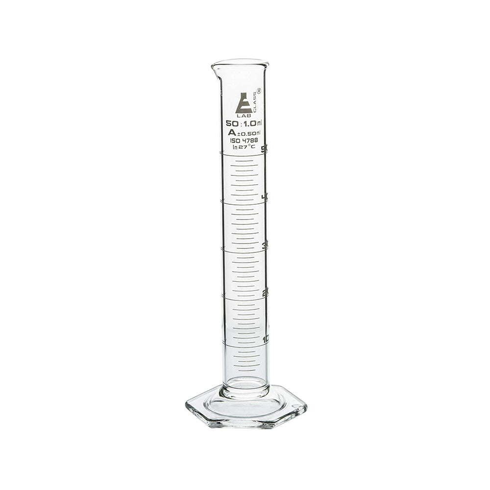 Measuring Cylinder, 50 ml, Graduated, Class-A, Hexagonal Base with Spout, Borosilicate Glass, White Graduations, Pack of 2