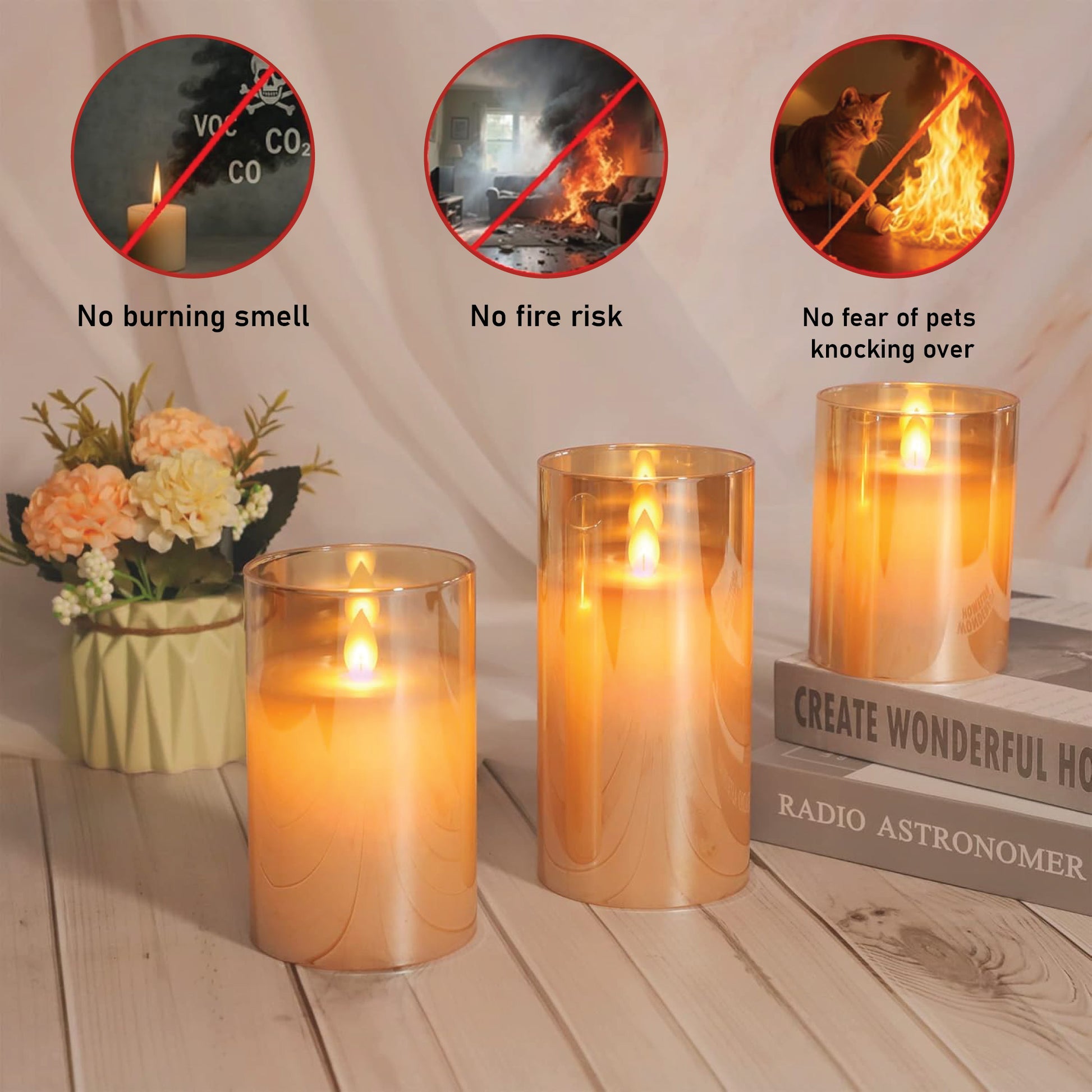 LABZIO Set of 3 Real Wax LED Flameless Pillar Candles with Flickering Amber Glass Effect, Color Changing & Remote Controller, Golden Acrylic Fiber Glass, for Christmas Home Decor & Festive Ambiance
