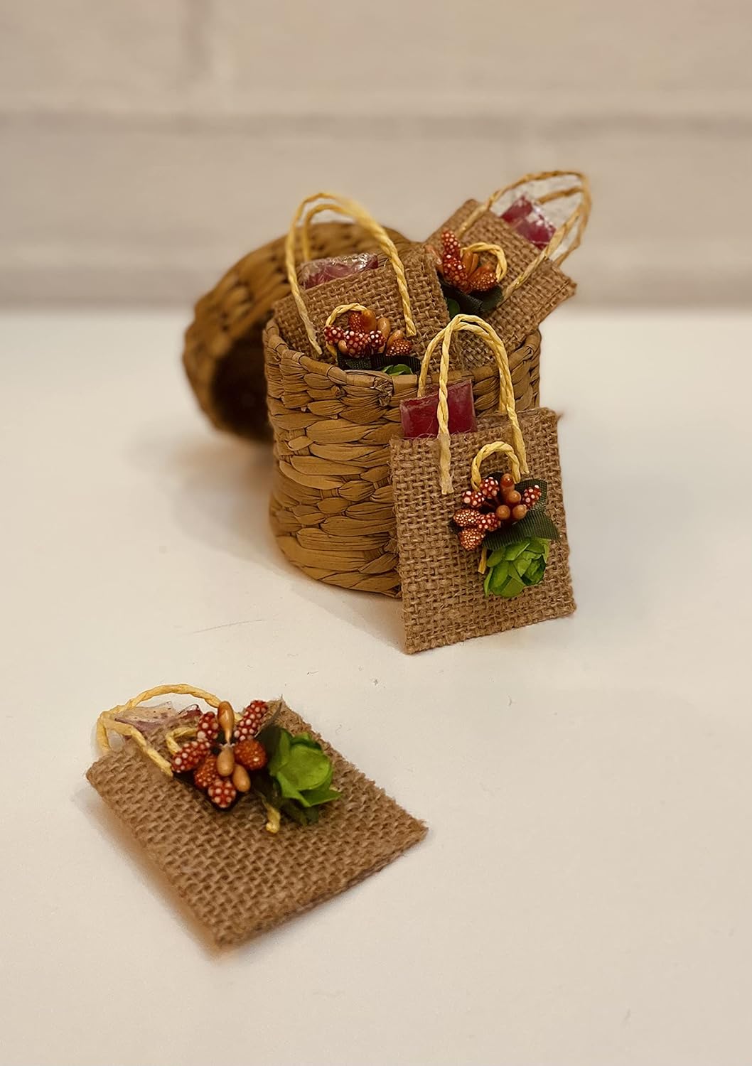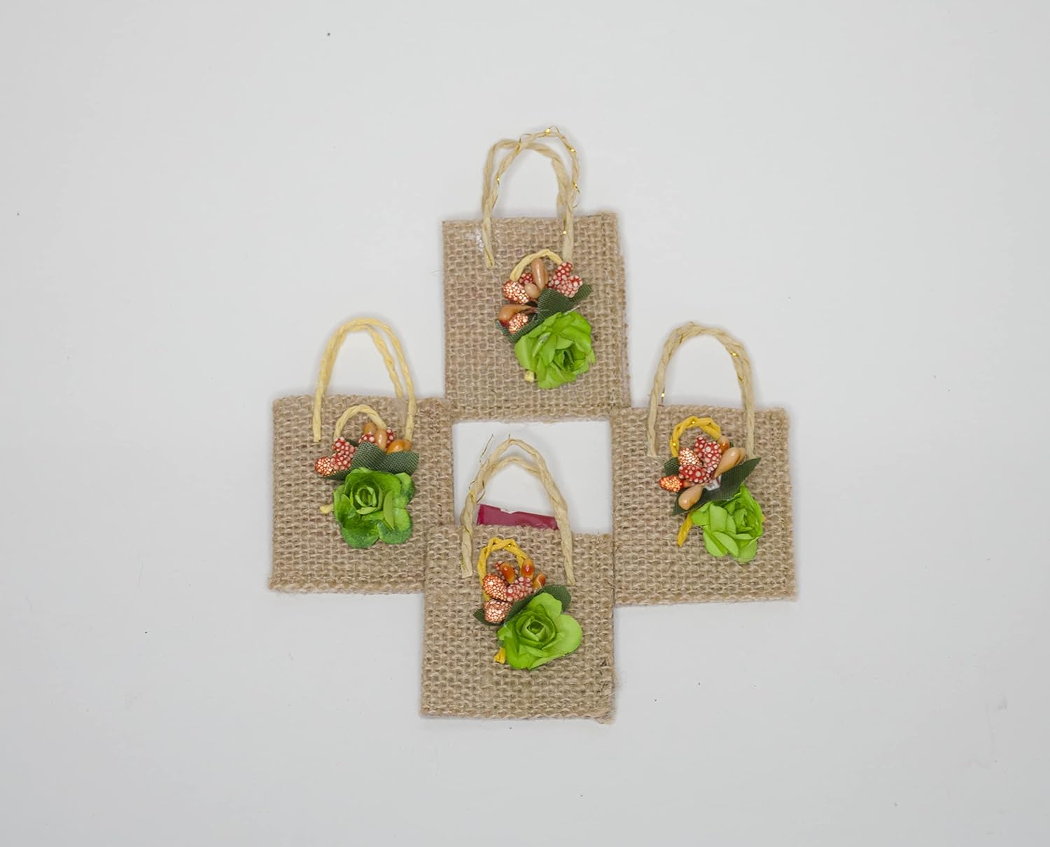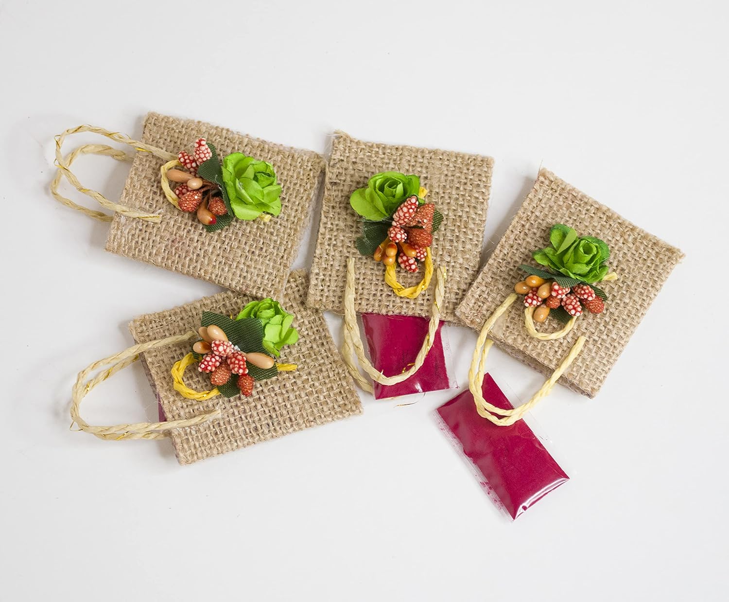 LABZIO Roli Chawal Bags For Tikka — Handmade Jute Small Sqaure Bags/Potli | Decorated With Flower | Perfect For Rakhabandhan, Bhai Dooj And Other Occasion/Festivals | Pack Of 4