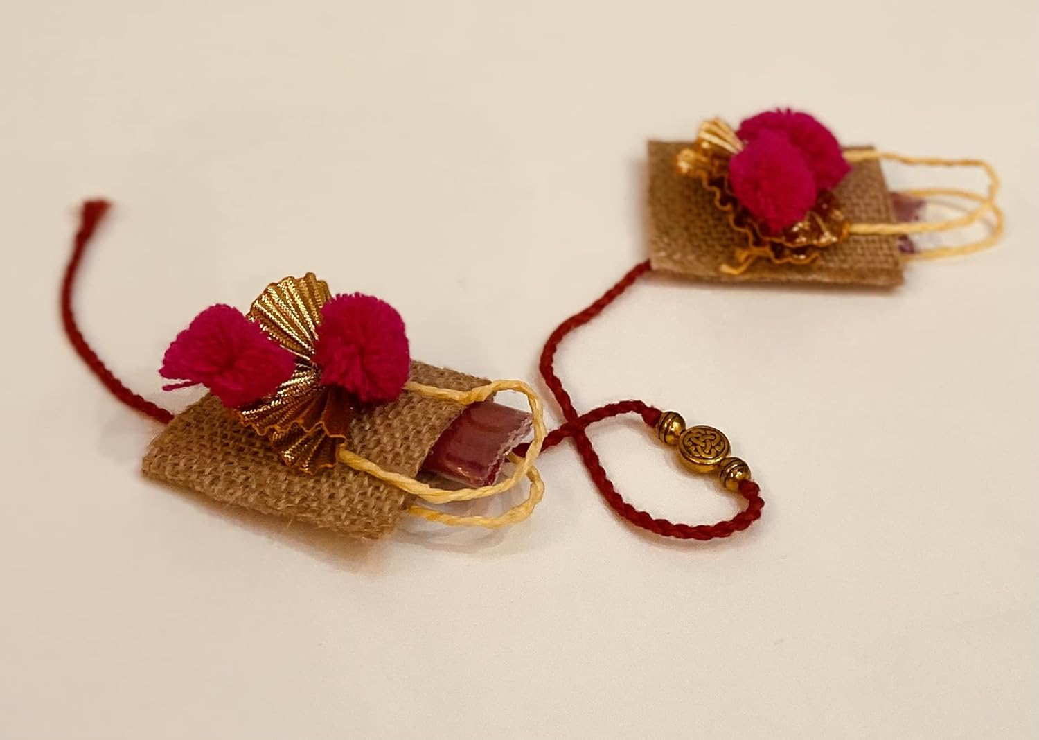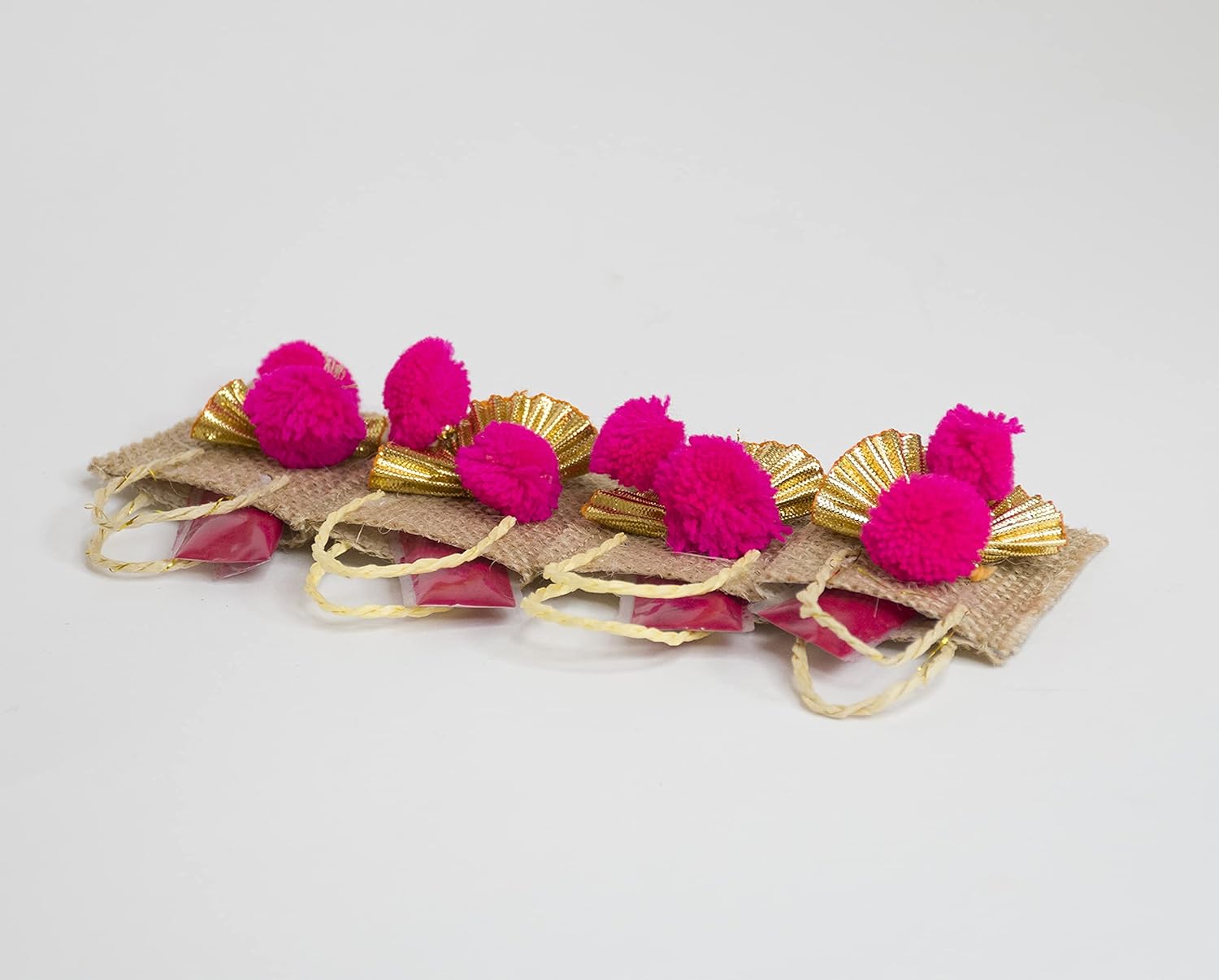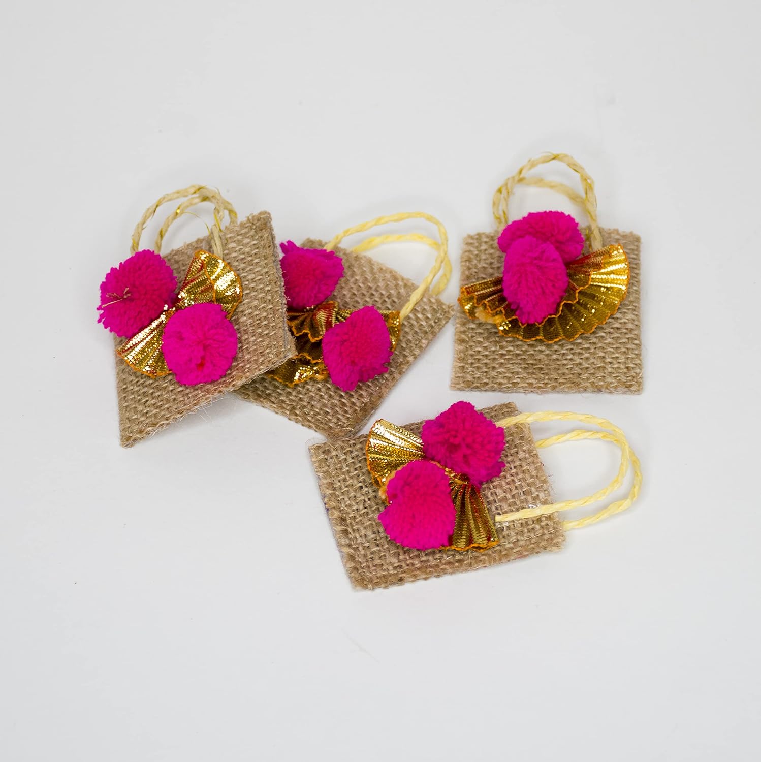 LABZIO Roli Chawal Bags for Tikka — Handmade Jute Small Sqaure Bags / Potli | Decorated with Pom Pom | Perfect for Rakhabandhan , Bhai Dooj and Other Occasion / Festivals | Pack of 4