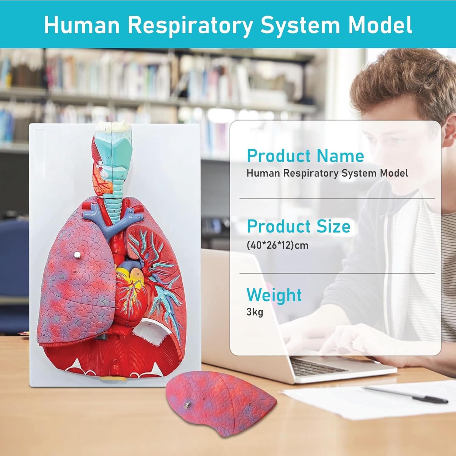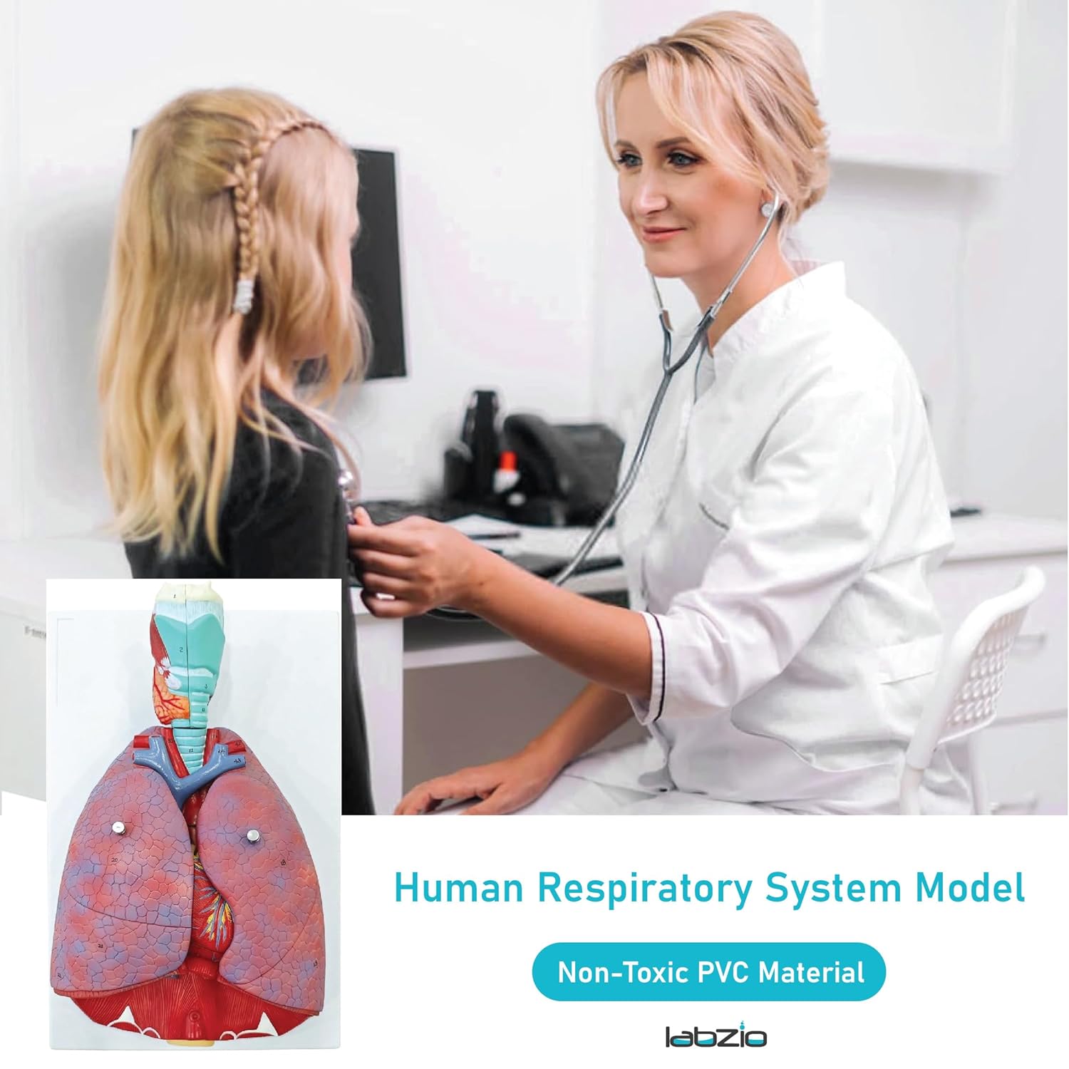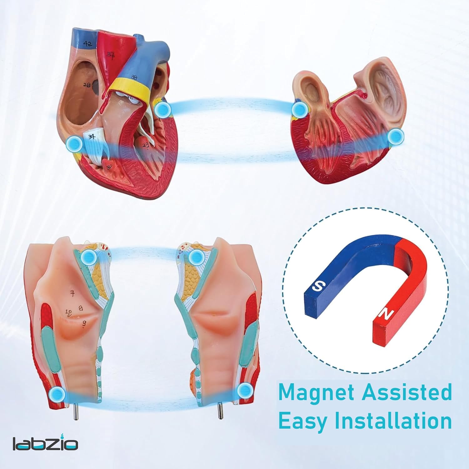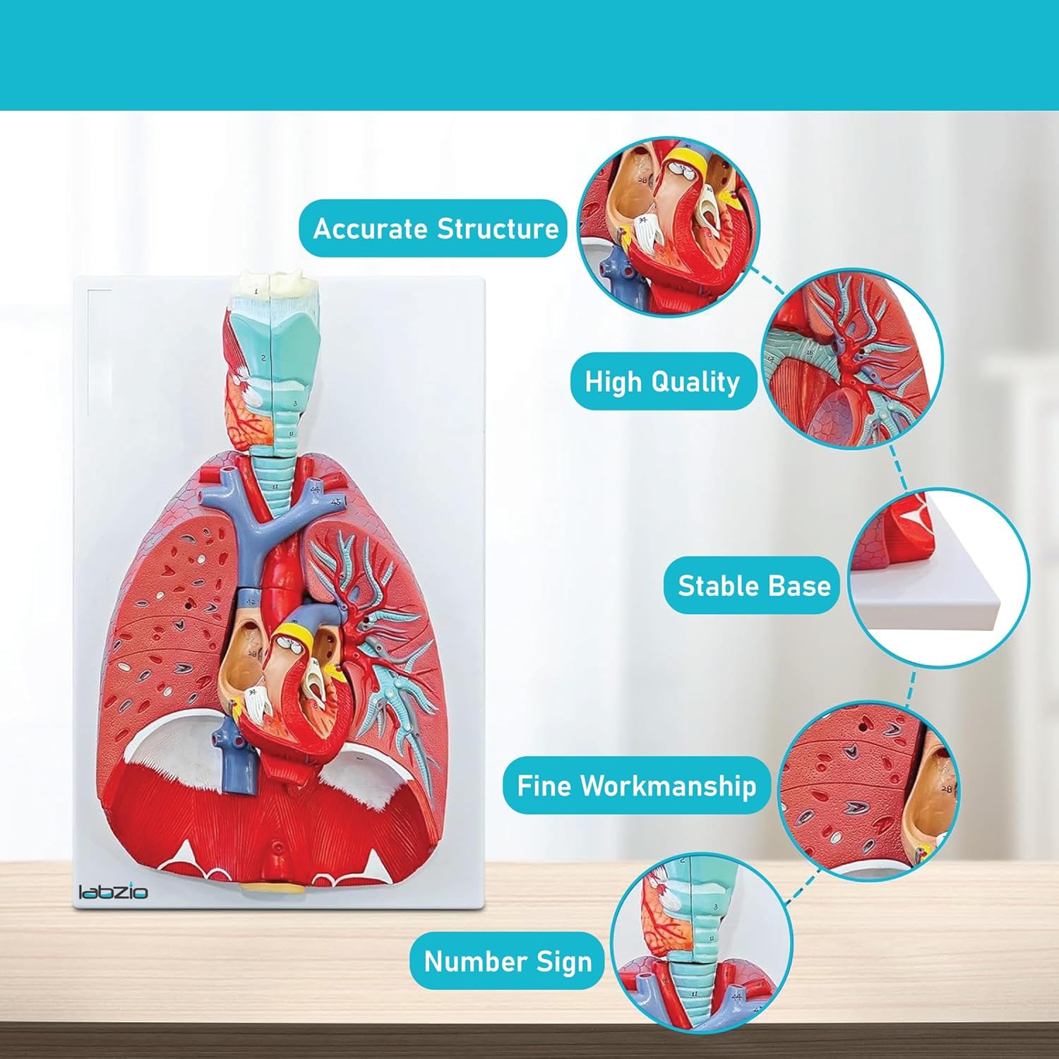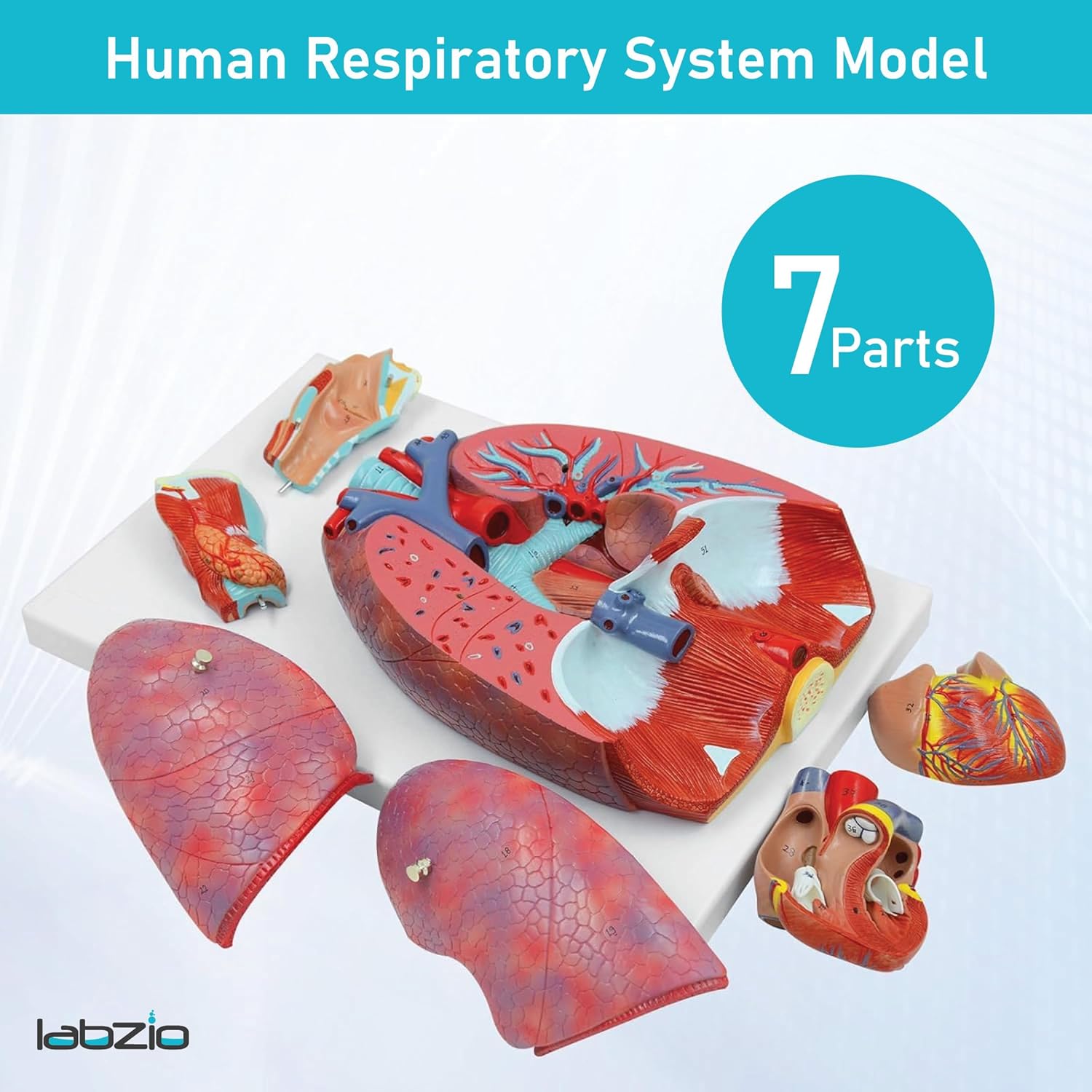 Labzio - Human Lung and Respiratory System Model, Life Size, 7 Removable parts including 2 parts Heart and detachable Larynx, detailed key card included