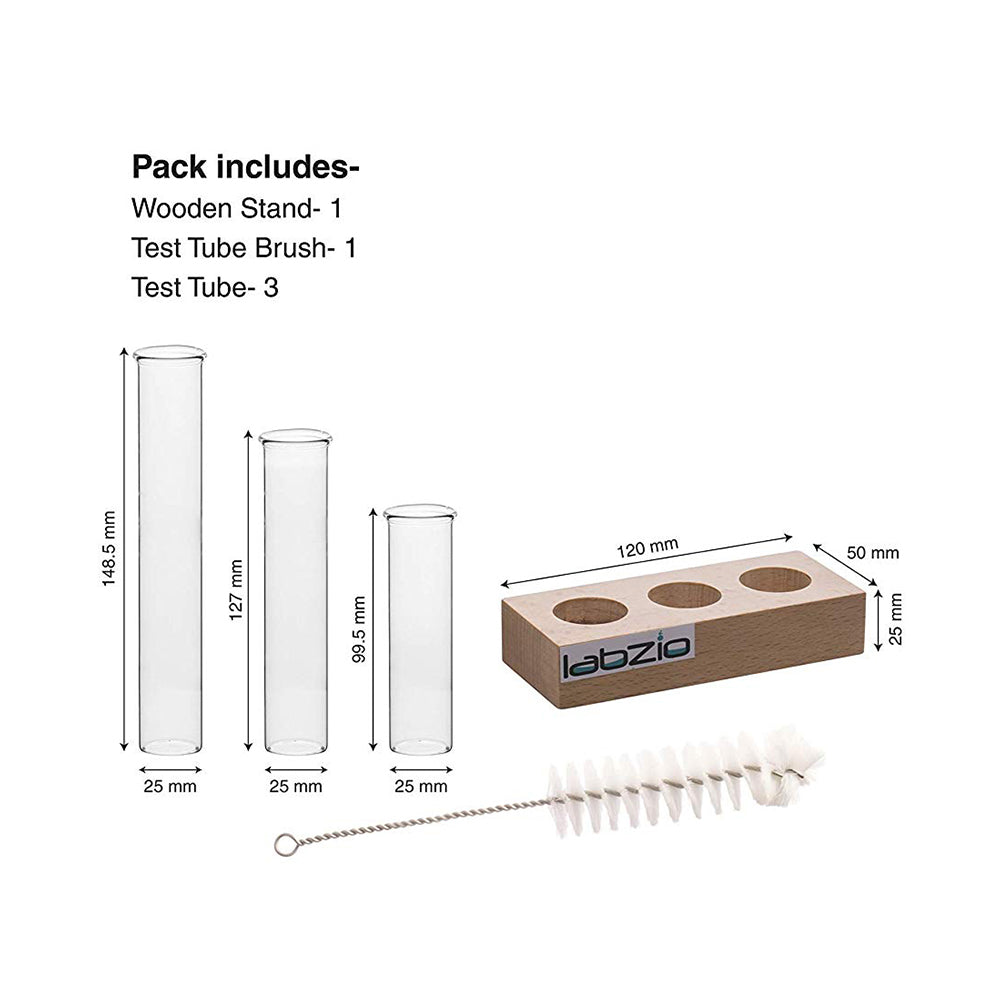 - Test tubes are hand blown borosilicate 3.3 glass. There sizes are 4" X 1 " , 5" X 1", 6" X 1". Test tube brush comes with it for the ease of cleaning them.