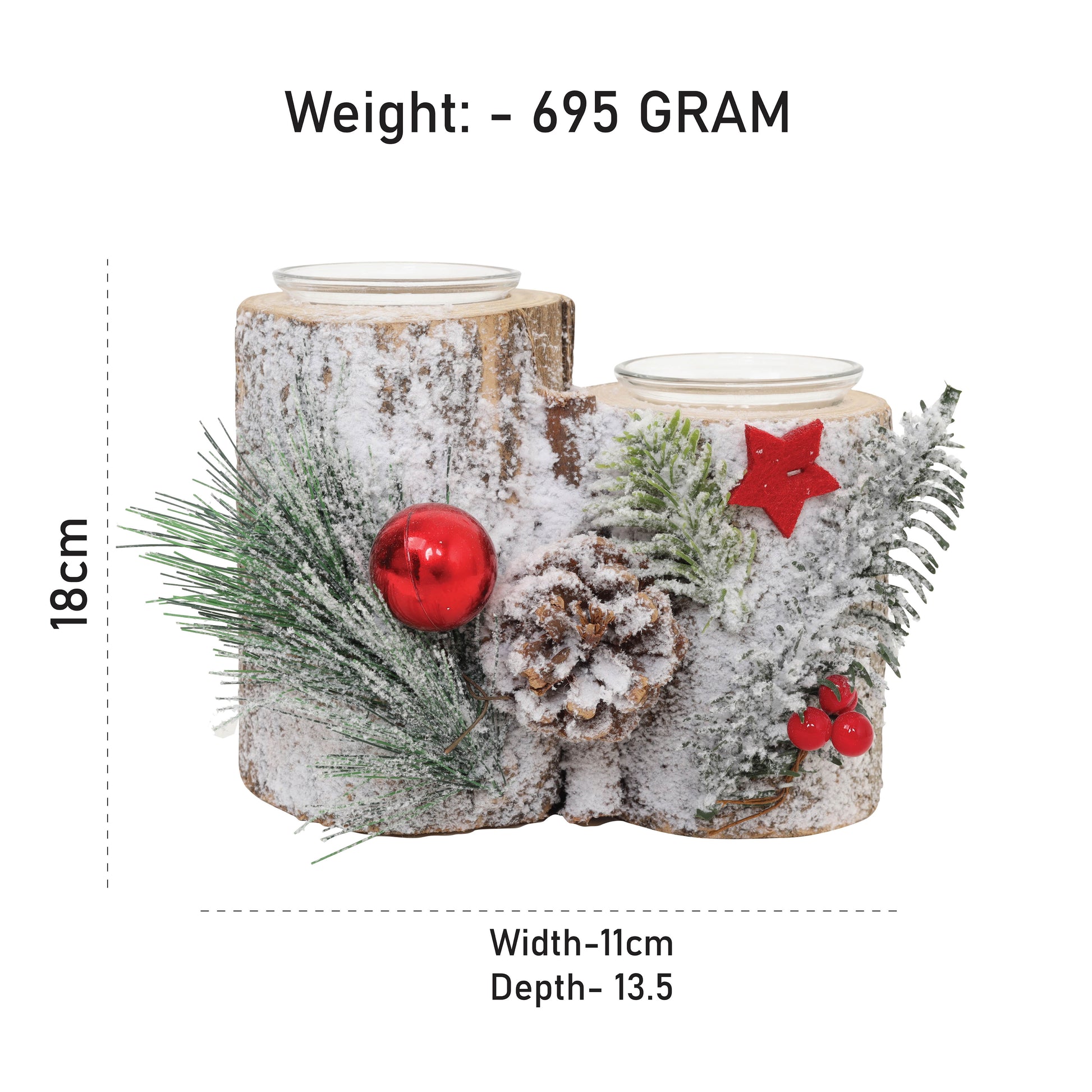 LABZIO Rustic Log Candle Holder with Winter Accents - Dual Tealight Holder with Pinecones, Faux Snow, Red Berries, and Evergreen Sprigs - Perfect for Holiday Table Centerpieces and Home Decor