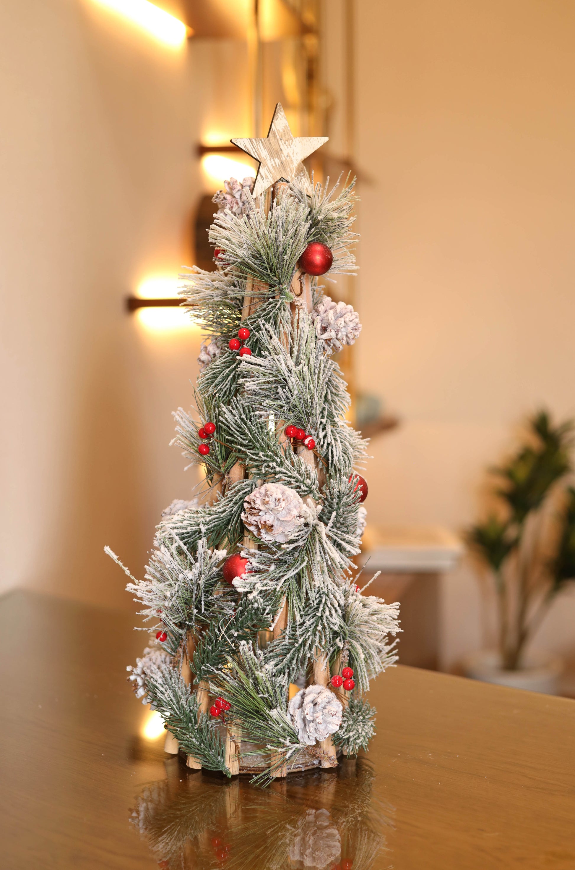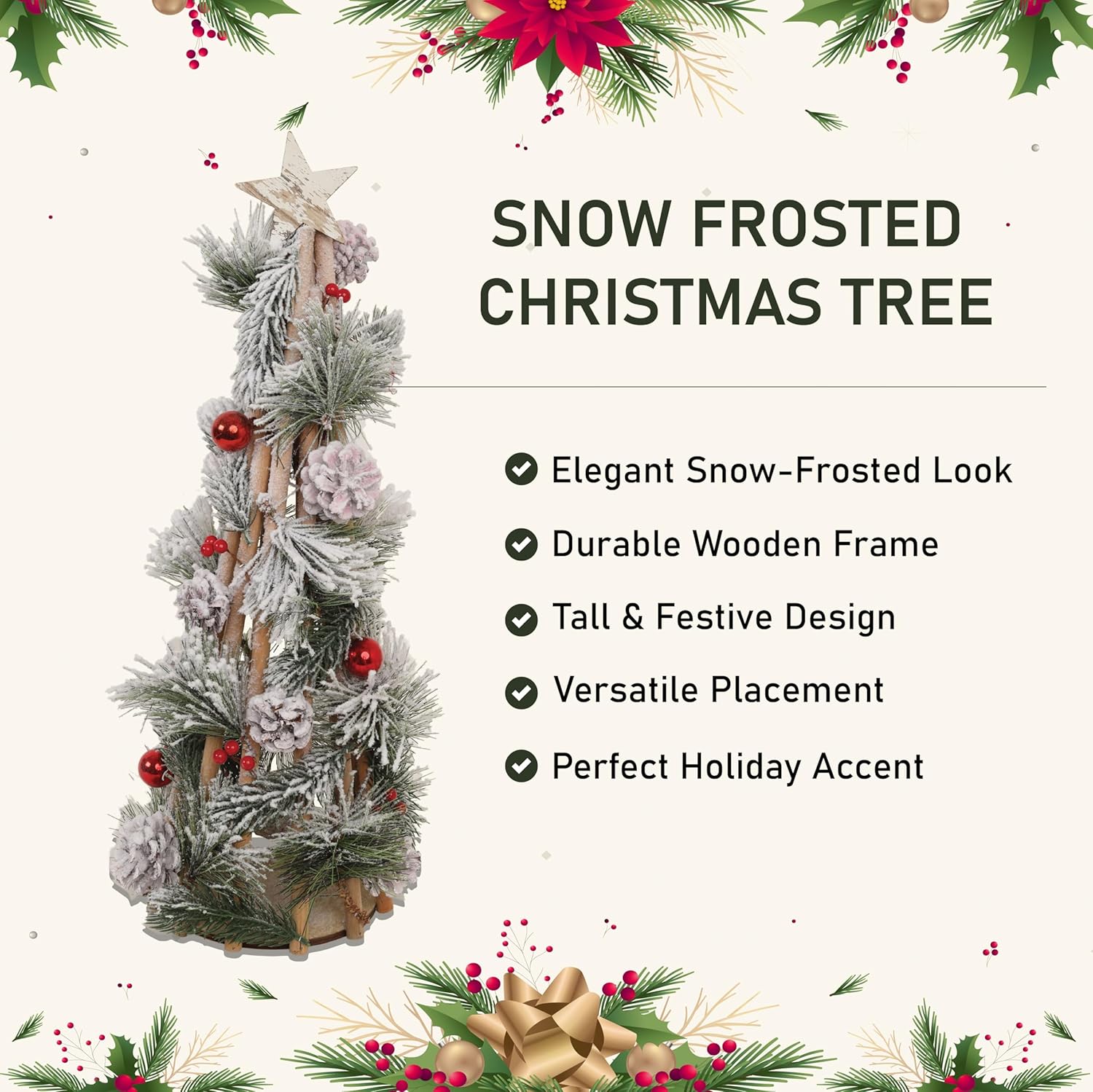 LABZIO Snow Frosted Christmas Tree - 57 CM Elegant Tabletop Decor with Pinecones, Red Berries, and Wooden Frame - Perfect for Holiday Tree Display in Home, Office, or Party
